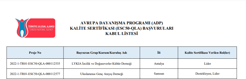 Uluslararası Genç Arayış Derneği olarak, Avrupa Dayanışma Programı’nın 2022 teklif çağrısı kapsamında ESC50 Kalite Sertifikası başvurusunda bulunduk. Başvurumuz, destekleyen ve lider rolü için kabul edildi.